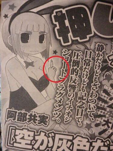 昨日の感想記事アップ時、携帯から更新しようとしたら、写真の貼り付けがうまくいかなかったので。 見開き予告で、空灰キャラが浦安キャラから中指立てられているの巻。 そしてどちらも、単行本広告荒ぶりすぎだろの巻。 (※浦安は一話きりのネタなんだけど…
